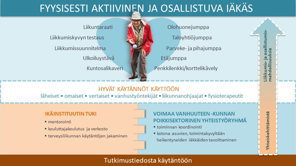 Valtakunnallinen Voimaa vanhuuteen – iäkkäiden terveysliikuntaohjelman päämääränä on edistää kotona asuvien, toimintakyvyltään heikentyneiden ikäihmisten (75+) itsenäistä selviytymistä ja elämänlaatua terveysliikunnan avulla.
